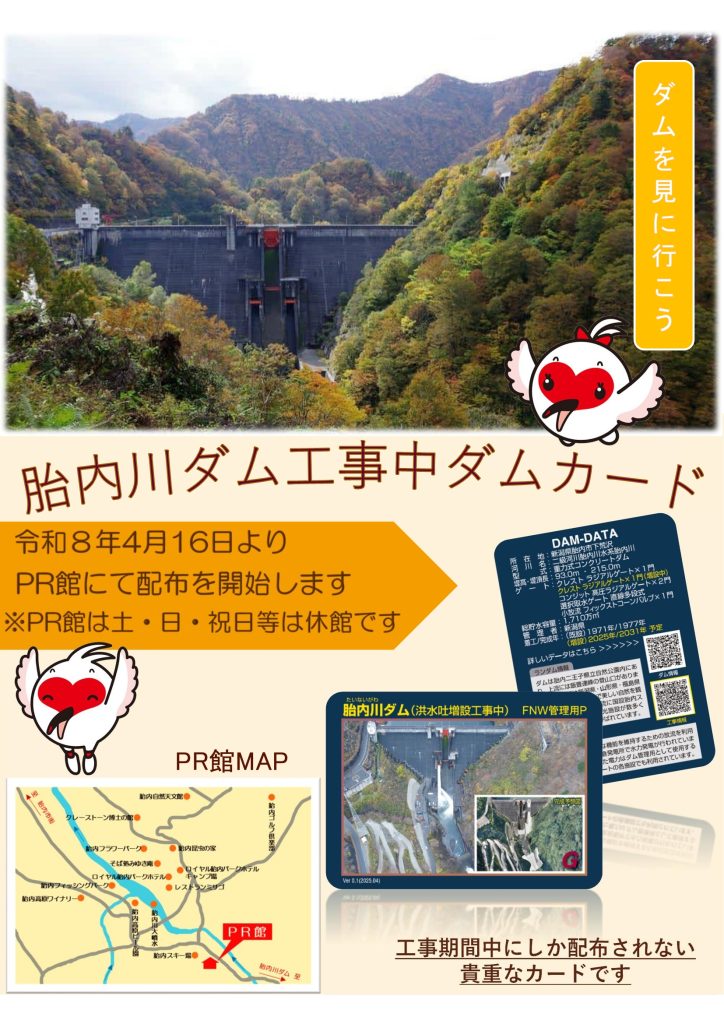 PR館 2026年度オープン! / topic / By tainai 皆様お待たせいたしました。冬季閉鎖をしていたPR館ですが、2026年4月16日より再開いたします。展示内容もパワーアップし、なんと今春からダムカードの配布も開始いたします!(お一人様1枚まで)皆様、是非とも足をお運びください。鹿島・福田・帆苅特定共同企業体
